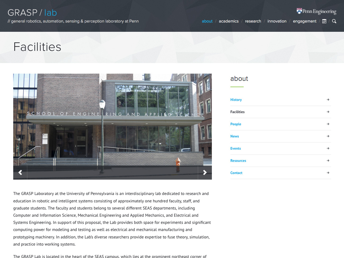 The GRASP Laboratory at the University of Pennsylvania is an interdisciplinary lab dedicated to research and education in robotic and intelligent systems consisting of approximately one hundred faculty, staff, and graduate students.